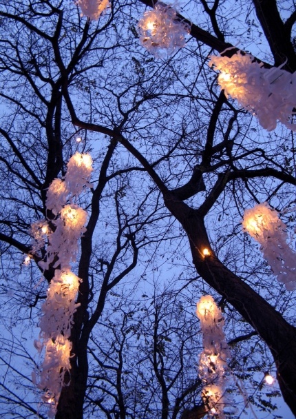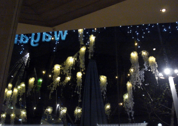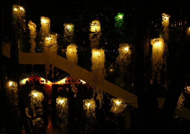 Cascade of Light was commissioned by the Southbank Centre for the Royal Festival Hall in London. It is one of a series of Studio Thadian Pillai light installations that explore concepts of consumption, waste and sustainability through the reuse of materials.