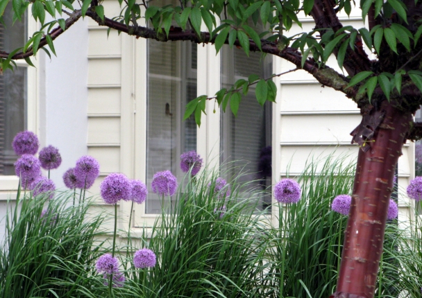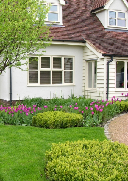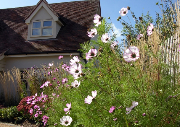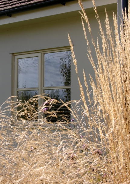This garden is an integrated, three-dimensional composition of architecture, planting and parking for six vehicles. The planting design has been created to be understood both at speed by passing traffic, and for more intimate experiences when arriving on foot. Evergreen forms respond to the topography of the site, anchoring the building to its context and providing a dramatic counterpoint to more ethereal herbaceous planting. Gossamer grass flowers in continual movement capture light dynamically. Deciduous skeletons and ornamental bark continue to present the building and provide visual pleasure throughout the winter.