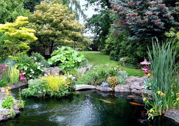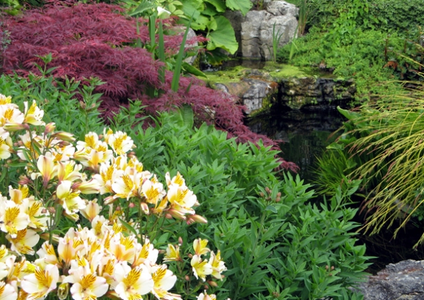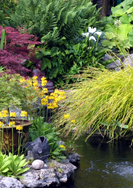 Planted texture exists in intimate dialogue with the texture of both house and garden architecture. Here, this includes the contrasting textures of wood, rock and water, luminous through the calming movement of fish.