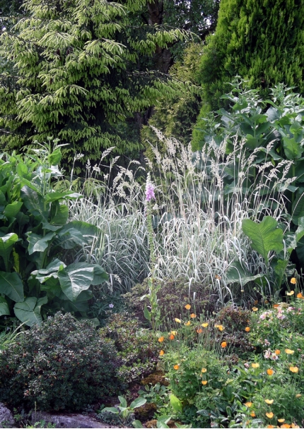 In this garden the aesthetics of texture have been emphasised; tactile, audible, sensual. Consideration has been given to plant textures both individually, and in association with each other; and under the different lighting conditions created by the passage of time. Providing long-lasting structural interest through the year, foliage texture is overlaid with the texture and excitement of seasonal flowers.